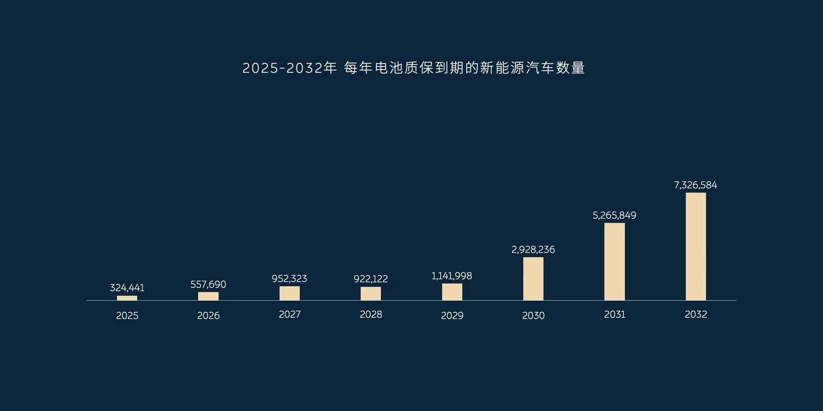據(jù)統(tǒng)計(jì)數(shù)據(jù)顯示,未來八年內(nèi),我國將有超過1900萬輛新能源汽車需要更換電池。這無疑給新能源汽車行業(yè)帶來了新的挑戰(zhàn)和機(jī)遇,需要制定出一個(gè)既對(duì)用戶,又對(duì)整個(gè)產(chǎn)業(yè)乃至整個(gè)社會(huì)更有利的電池壽命方案。